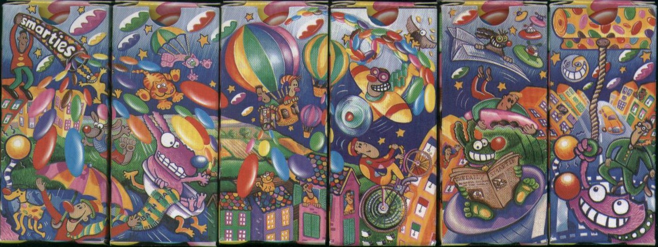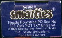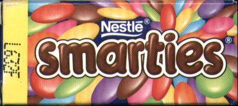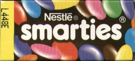 This is unusual. The word 'smarties' is written in black on both ends of the box.